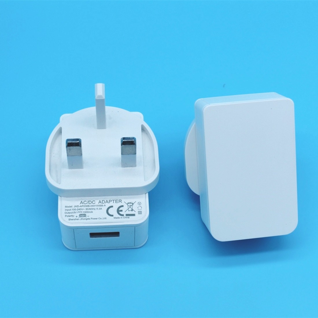5V1A英规USB充电器,USB电源适配器。产品型号:JHD-AP008B-050100BB-A,输出电压5V,输出电流1A,最大输出功率6W,内置电子兼容防干扰线路,通过CE-EMC,CE-LVD等认证,广泛应用于小家电、电子数码、IT通讯、安防监控、照明等。